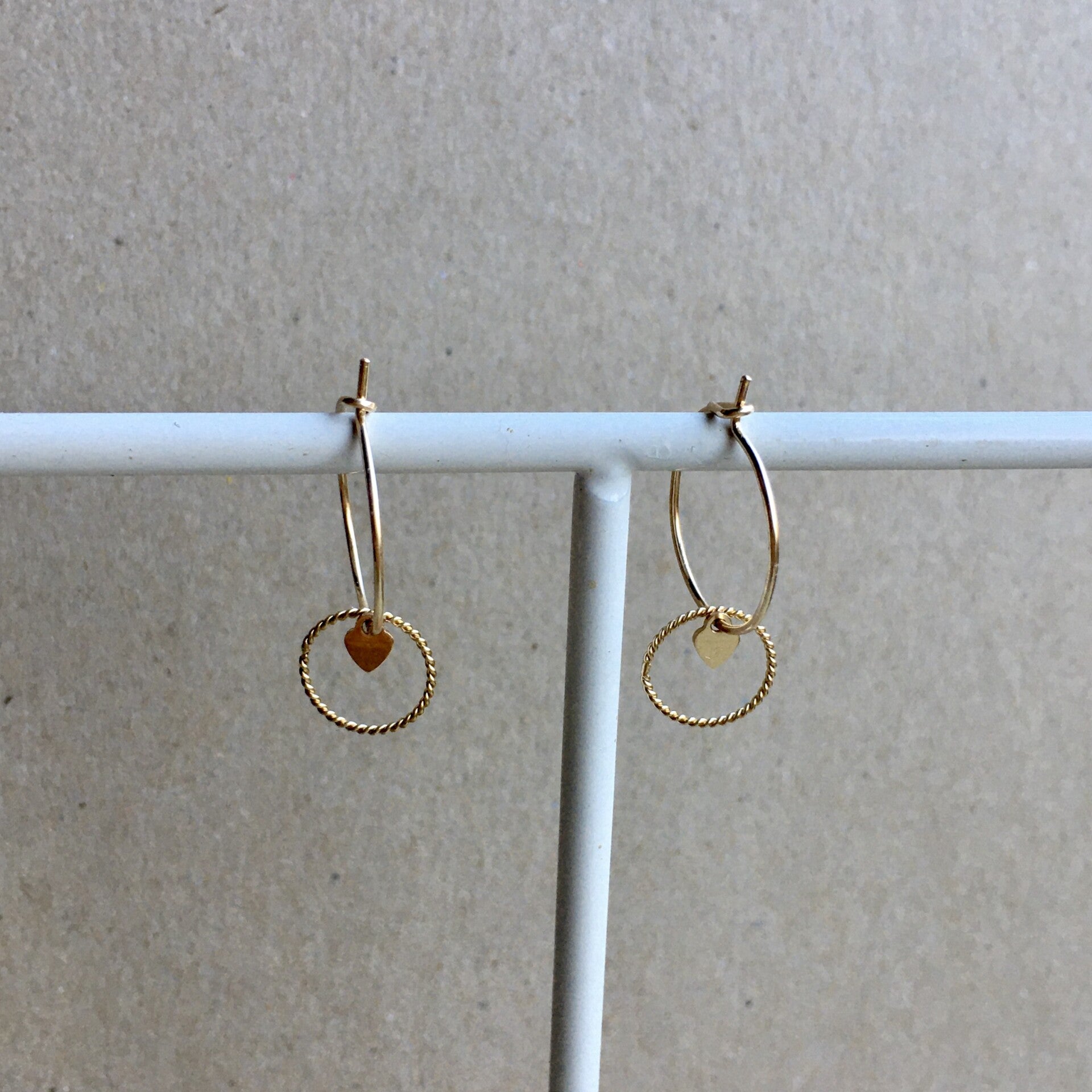 Subtiele 14 karaat goldfilled ringetjes met een klein hartvormig labeltje en gedraaide ringetje.