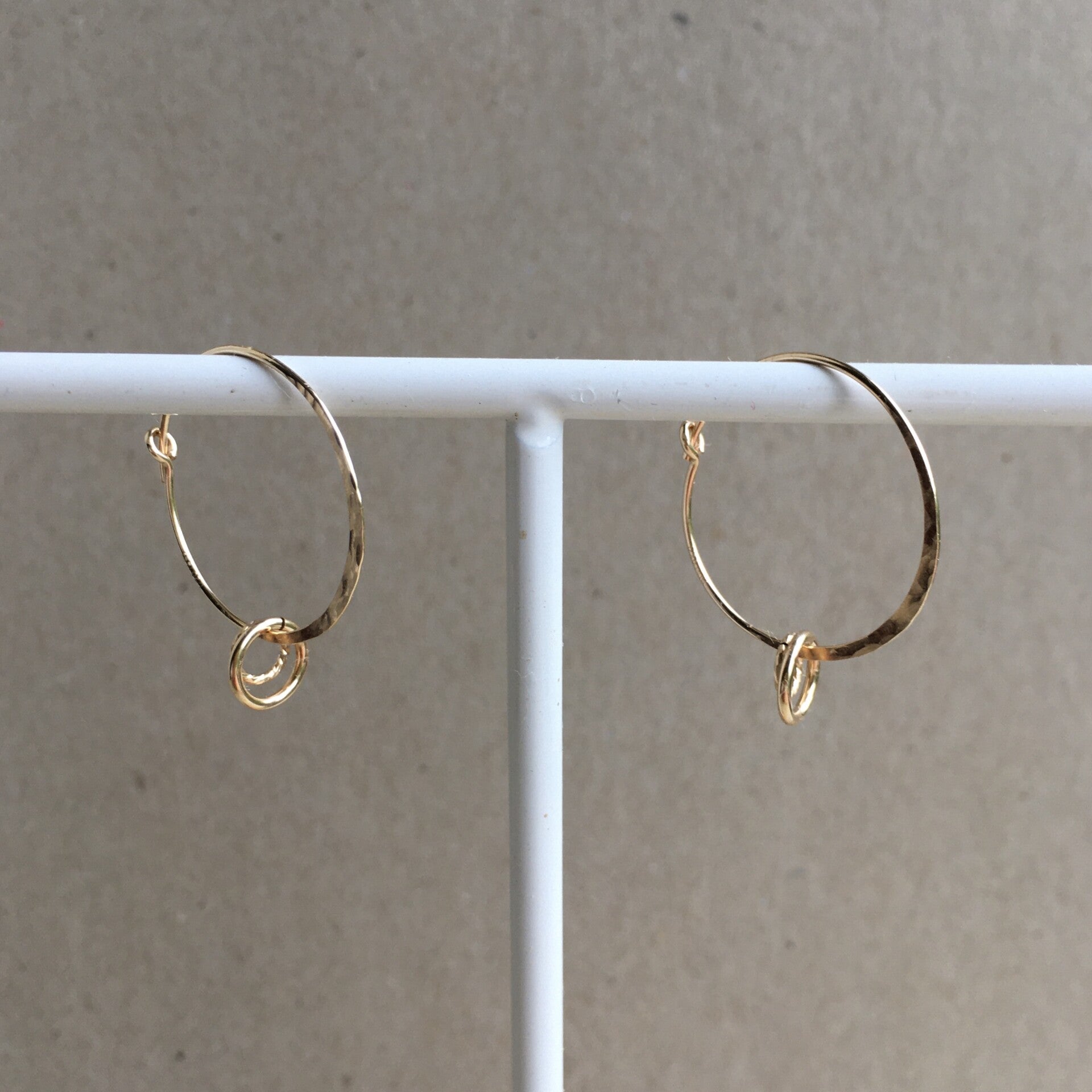 Bohemian, licht gehamerde 14 karaat goldfilled ringen met twee sprankelende, bengelende ringetjes er aan!